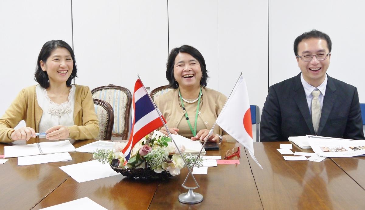 在東京タイ王国大使館 パッタラット・ホントン公使参事官(中央)、ヨーディン・スパスリー一等書記官(右)、橋本たみ・文化広報部スタッフ(左)。(タイ大使館への表敬訪問・2014年12月19日撮影)