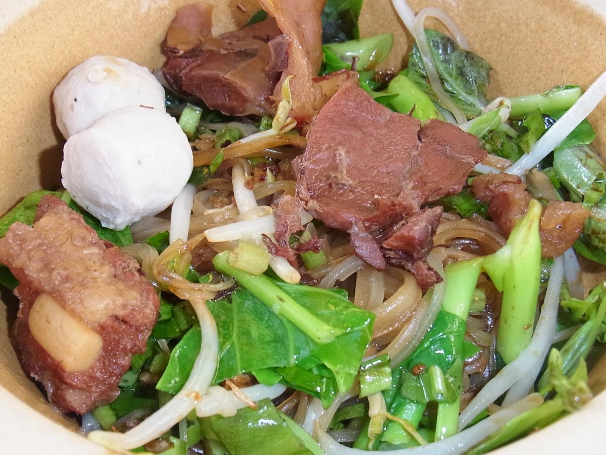 この店では透明スープのナムサイ、トムヤム風味のトムヤム、煮込んだ豚肉がおいしいムートゥン、赤い腐乳を入れたイェンタフォーがスープの種類になる。ほかにはワンタンのからあげや炒め物とご飯などもある。料金は麺類は40バーツ(約145円)から、食事も100バーツ(約364円)前後で食べられる。