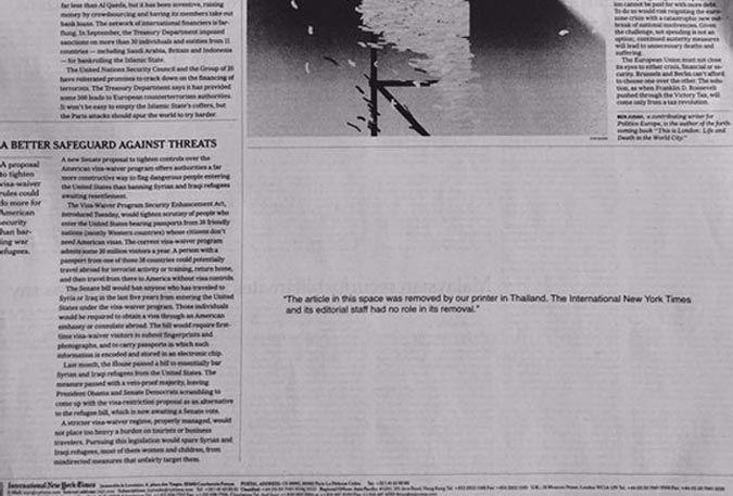 また、ニューヨークタイムズ紙は、タイ人男性逮捕の記事を掲載しようとしたところ、前回12月1日と4日に続いて、印刷所の自主判断で掲載をしなかった。ニューヨークタイムズ紙の記事が空欄のまま発行されたのはこれで4度目。