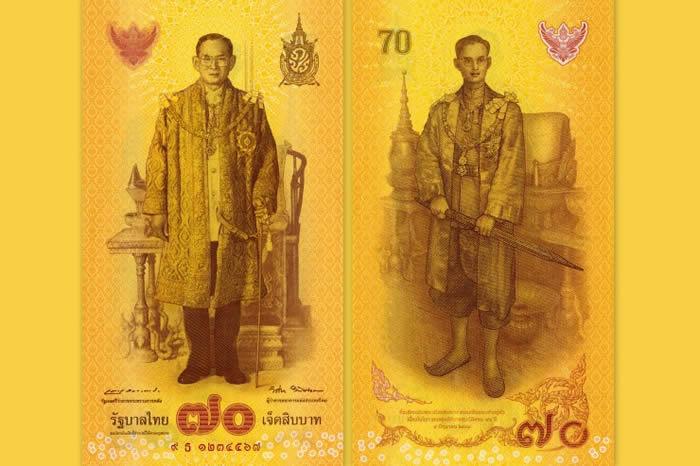 2016年5月30日、タイ中央銀行(BOT)はタイの現国王であるプミポン国王陛下(ラーマ9世)の在位70周年記念として、70バーツの記念紙幣を6月9日に発行すると発表した。