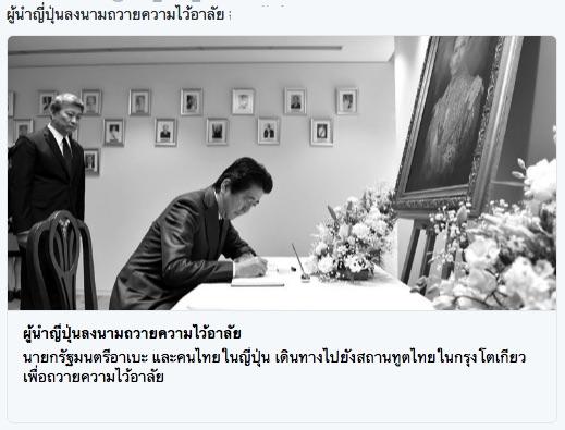 東京のタイ大使館で記帳する安倍首相を報じたタイメディア