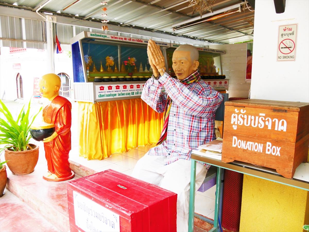 新たに、浄財お礼人形を設置した寺院では、赤のボックスに浄財をいれると、人形がお辞儀をして感謝の気持ちを伝えてくれる。珍しさから評判になり、1カ月に約1万バーツ(約3万円)の寄付が集まるそうだ。