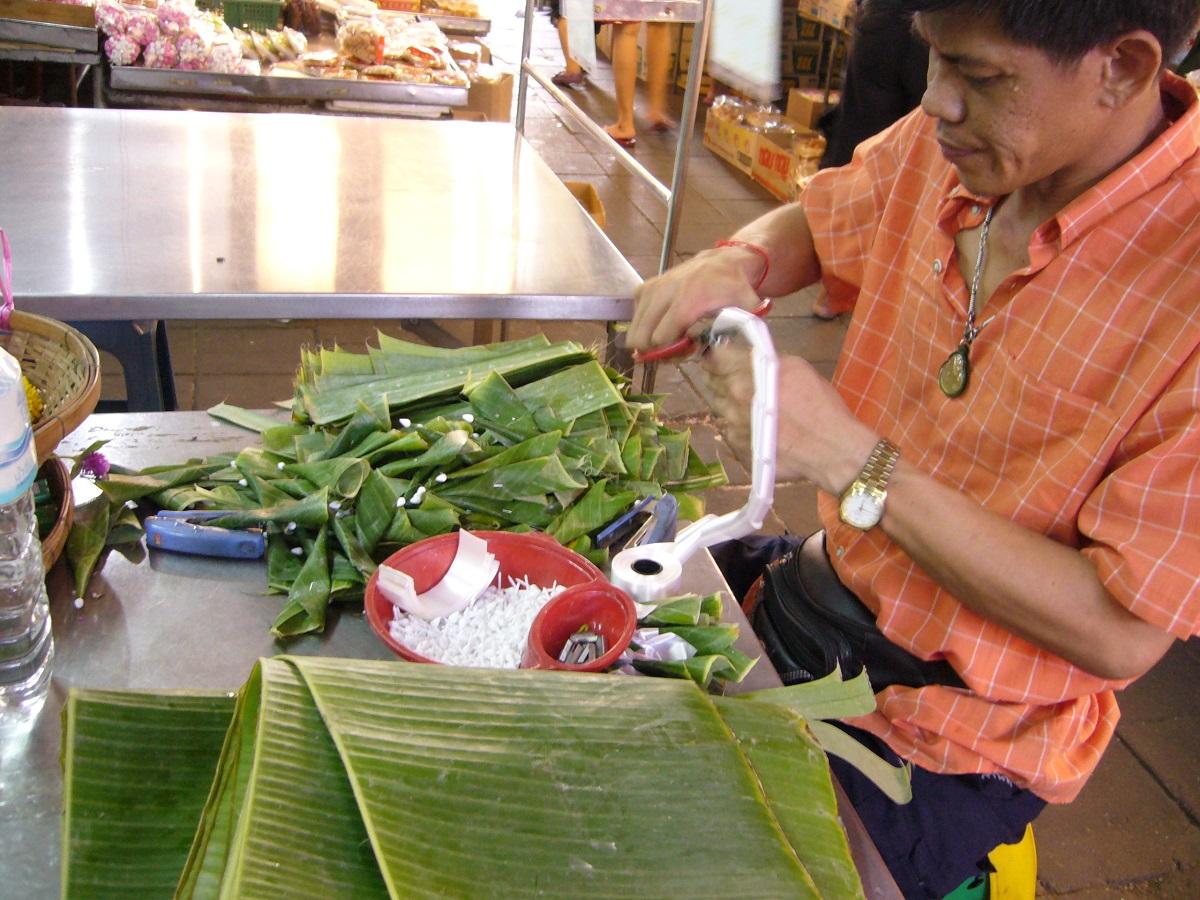 そして、タイデザートとなるとほとんどバナナの葉で包まれて店先に並んでいます。魚や野菜をバナナの葉で包んで焼くものも、屋台でよく見かけます。ほのかな良い香りと殺菌作用のために使われるのだそうです。バナナの活躍度は本当にものすごいですね。