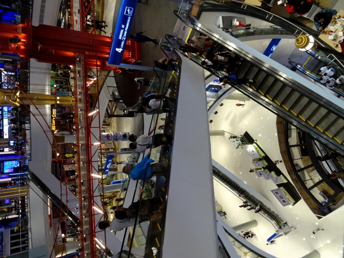 施設内のデザインも凝ったものになっており、吹き抜けを覗きこむとエスカレーターが複雑に入り組んでいるのが見える。
