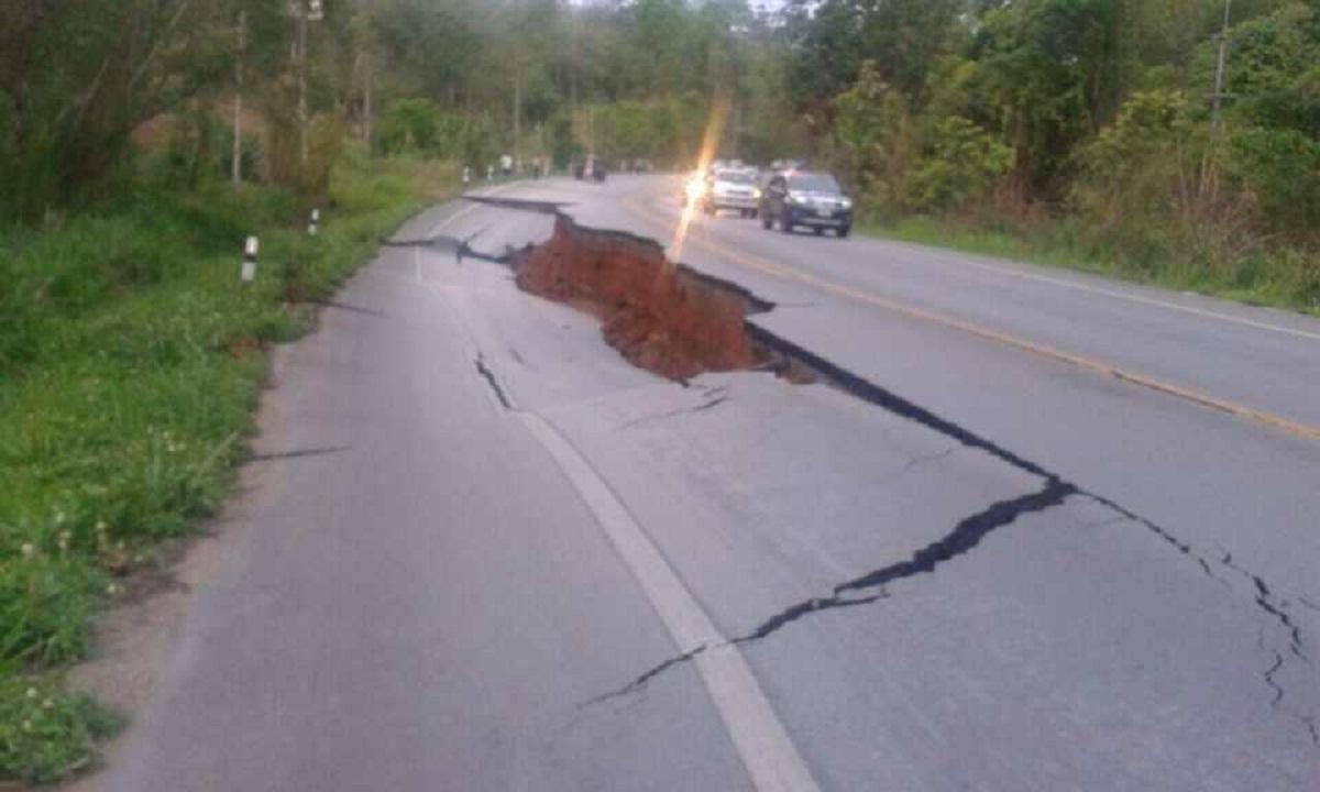 地震により地割れして、亀裂が入った道路。