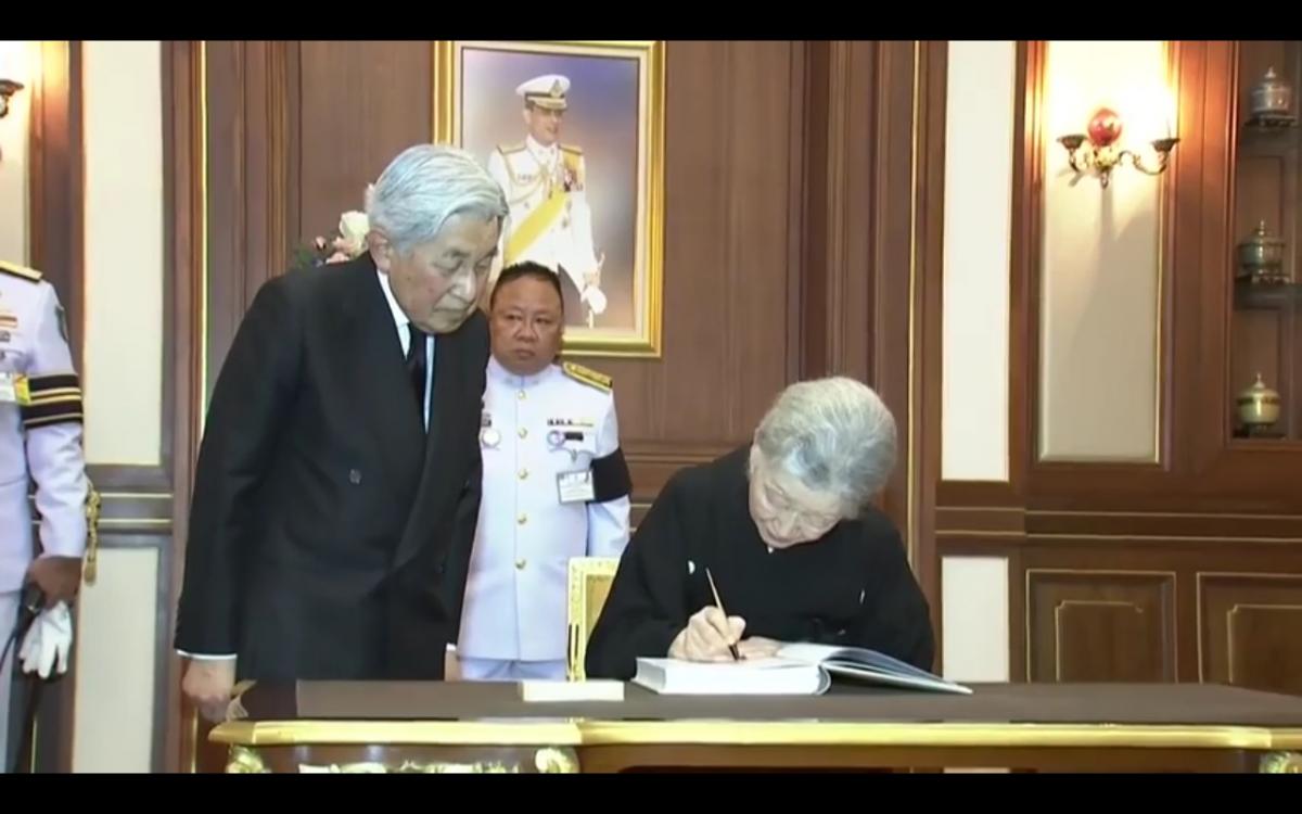 天皇陛下ご夫妻は、王宮に安置されているラマ9世を弔問。献花、 記帳を終えられた後、新国王ラマ10世に謁見した。