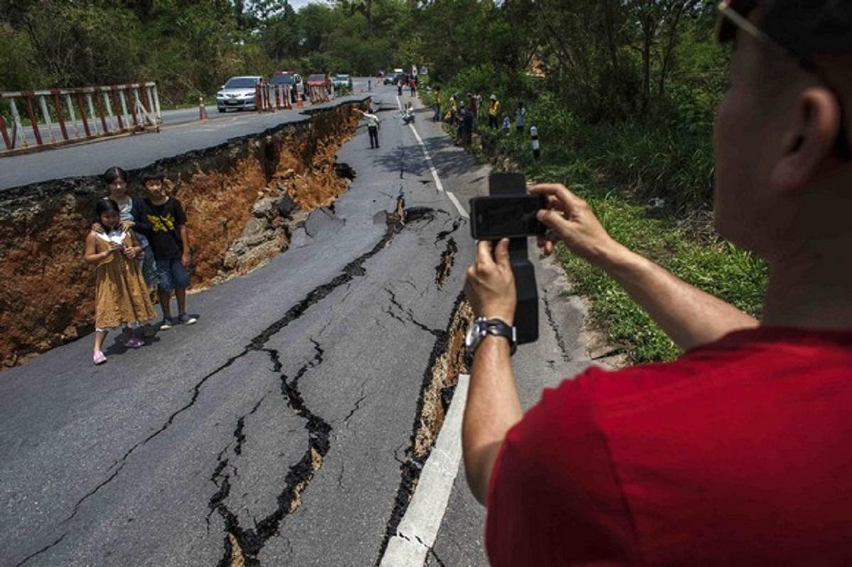 大きな亀裂が見つかった道路で記念撮影。タイ人らしい光景ではある。