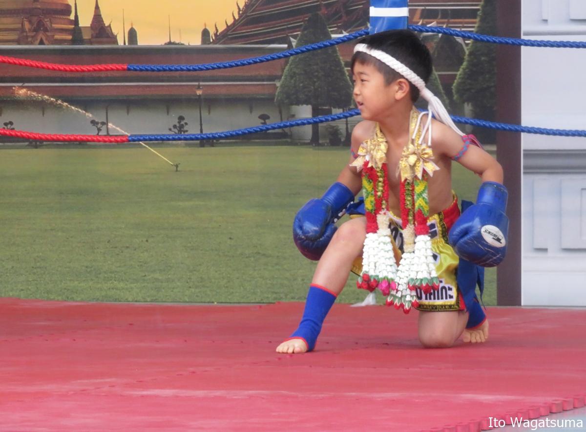ステージ上に作られた本格的なリングへまず上がったのは、ムエタイ歴1年の三浦泰志くん(6歳)。その泰志くんを迎え撃つのは、はまっこムエタイジムのユタポン前田代表。両者リングインし、頭にモンコンをつけて、戦い前の儀式であるワイクルーを行う。ワイクルーは、戦いの神や師匠、両親へ感謝を示すための儀式で、ムエタイでは必ず行われるものだとリングアナが説明する。ワイクルーを終え、両セコンドへモンコンを外して渡し、ゴングが鳴る。開始早々に泰志くんの連続ハイキックが代表の腹部へ入る。代表も応戦するが、泰志くんのハイキックが代表の側頭部へきれいに入りダウン。試合は、泰志くんが勝利を収めた。