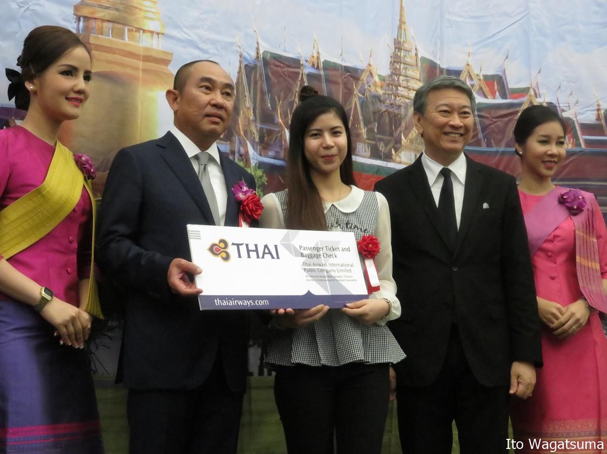 タイ国際航空から東京-バンコクの往復航空券が贈呈(2017年5月13日撮影)