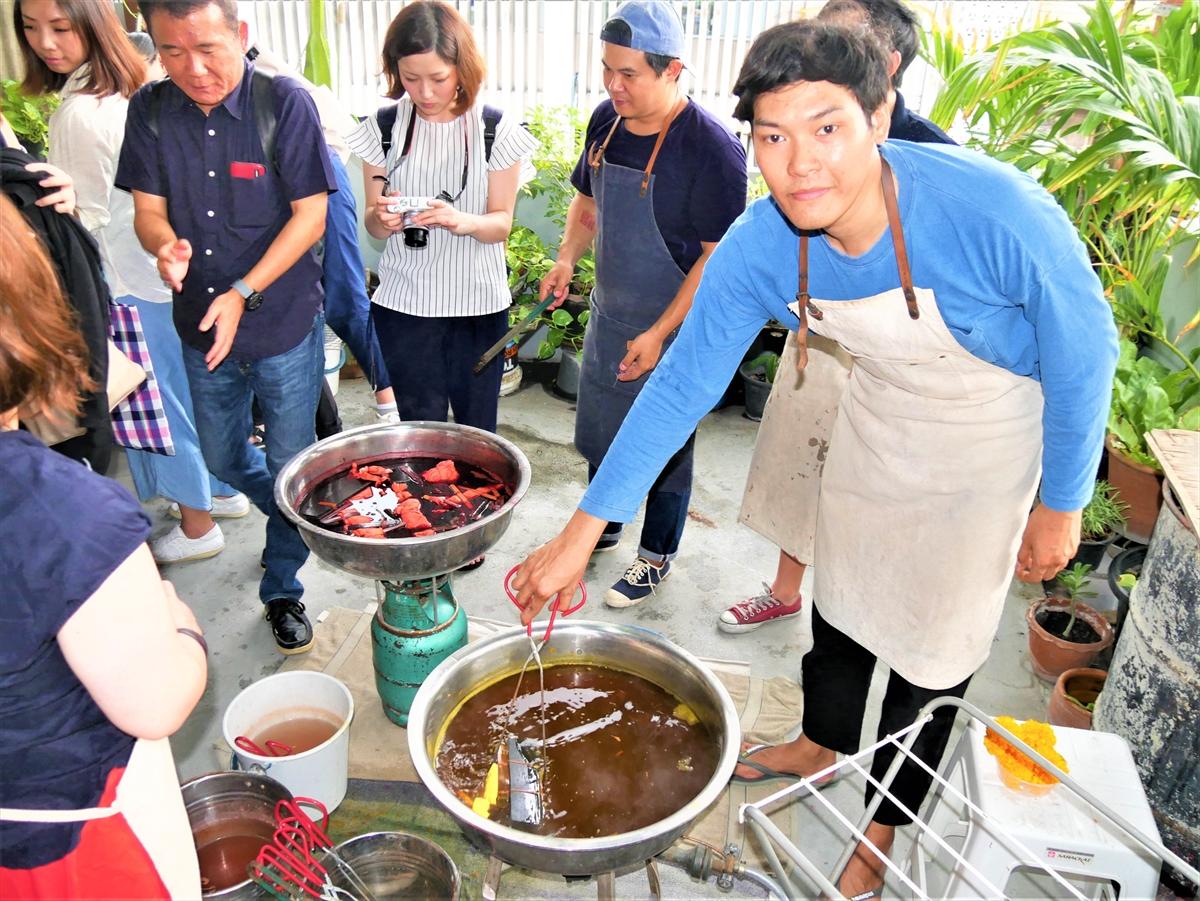 一行(30名)は、体験型アクティビティとして、バックペインティングを、バンコク市内のCharm-Learn Studioで挑戦した。タイの草、花、木皮などを染料として使用するエコツアー。講師から説明を受け、参加者それぞれの感性を生かしたデザインで染物に挑んだ。加熱した染料に約10分間漬け込み、水洗いの後乾かして完成。この日は黄(花)、赤(木皮)の2種類の天然染料が用意された。化学物質を一切使用しない自然の天然染料は、地球にやさしく環境保全の意義も高く、今後さらに関心を集めそうだ。メンバーは17日朝、クラビに移動する。