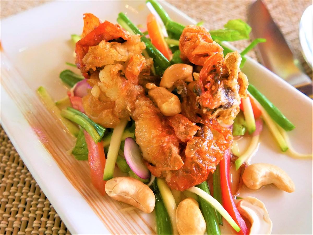 原生マングローブ林で穫れたカニの脱皮の瞬間を待って調理したソフトシェルクラブは、絶品。自家農園で有機栽培している野菜(ブロッコリー、ニンジン、グリーンピース、アスパラガスなど)は、新鮮で味が濃く美味しい。