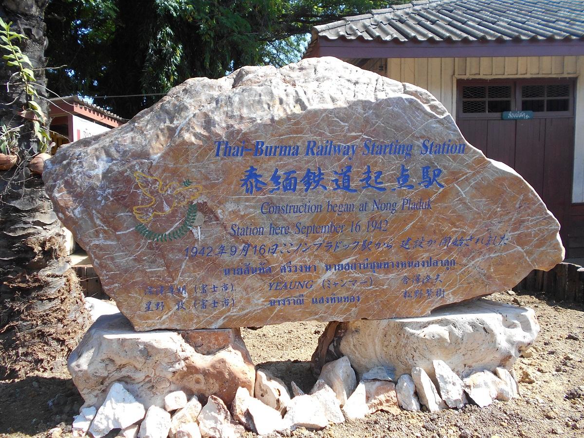 バンコク・ノーイ駅からカンチャナブリ駅までの途中の駅にあった泰緬鉄道起点駅の石碑。