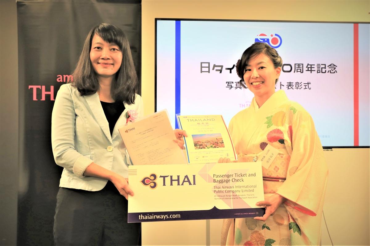 タイ国際航空 往復航空券を受け取る 風景部門・優秀賞「バンコクの煌めき」庄司弘子氏(右)、(撮影・タイ人写真家 セッタポン)