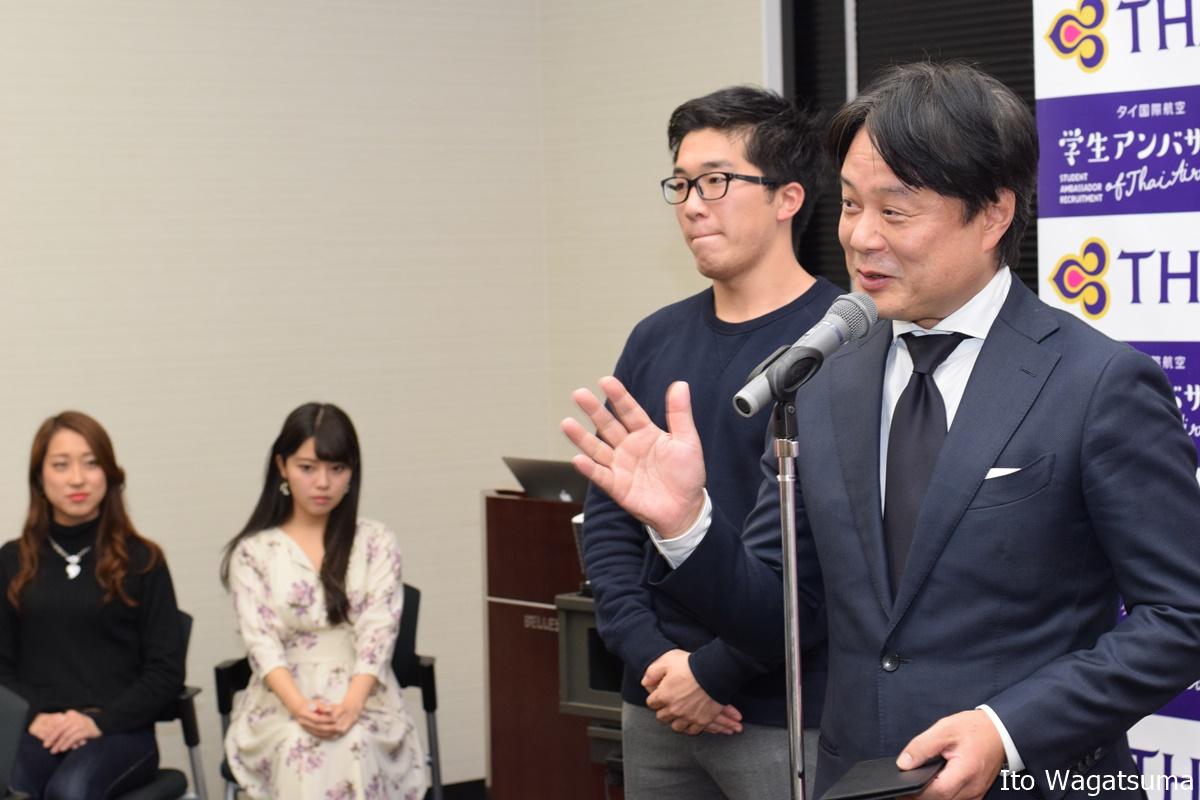 タイ国際航空の大畑俊弘日本地区マーケティング本部長は、「学生アンバサダーキャンペーンは、若い世代の海外旅行離れが進んでいると言われて久しい中で、夢や目的を持った旅行をサポートしたい。そして、若い世代にタイ国際航空の魅力を知ってもらいたいという想いで企画したものです。4月に東京、大阪、京都で説明会を実施し、5月と6月に募集、7月上旬に面接選考を行い、東京3人、大阪3人の学生をアンバサダーとして任命させてもらいました。