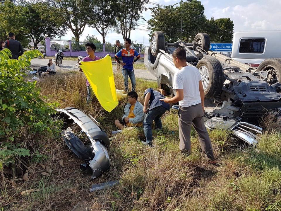事故があったのは、タイ北部ターク県ワンチャン郡の国道。見通しの効く直線道路を100kmほどで走行中に、道路に舗装が剥がれて空いた穴に差し掛かった為に、それを避けようとしたはずみ電柱に激突。さらに道路脇のくぼみに落ちて、そのまま横転したもの。