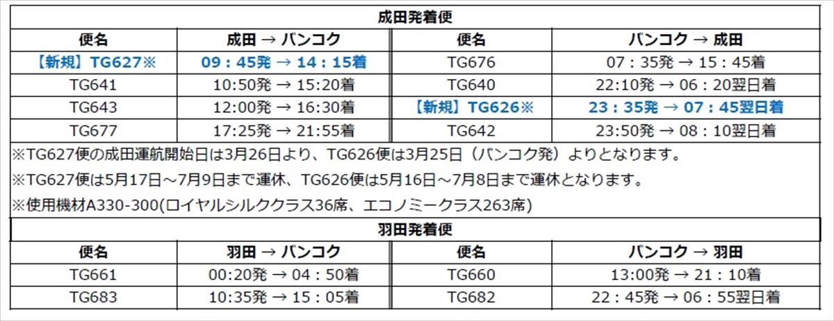 新規運航となるのは、成田発TG627便とバンコク発TG626便。TG627便は14:15バンコク着となるため、