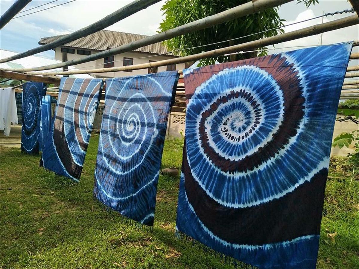 様々な色合いや模様を染め上げる技を学び体験。染料の原料となるホームの木は、この地方の涼しく湿気の多い土地に自生するキツネノマゴ科の低木で、奄美・沖縄地方で同じく藍染めに使われるリュウキュウアイ(琉球藍)の仲間。