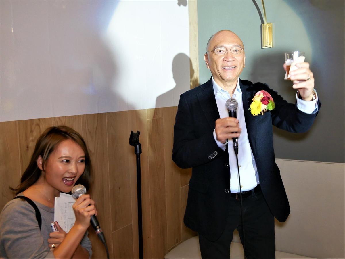 乾杯の発声をするマンゴーカフェの、ピタヤ オーナー(右)
