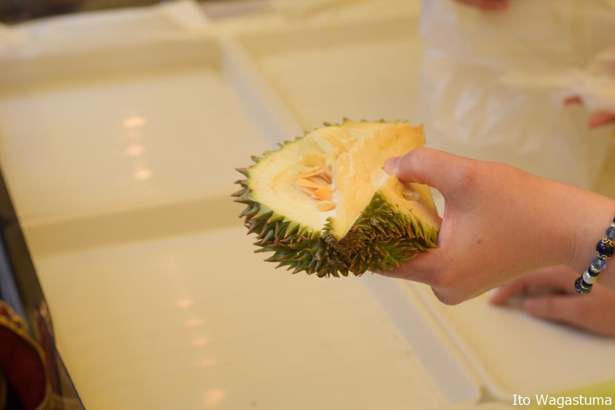 最後は、 クワタイの対面に並ぶ「フルーツ市場」と名付けられたフルーツブース。山積みとなった果物の王様ドリアンが人気を集めていた。