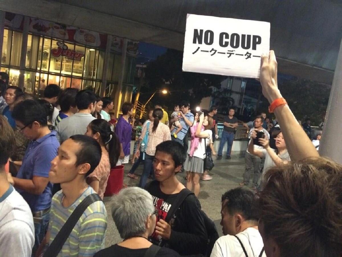 2014年5月27日現在、タイ国軍による実質的なクーデター、政権掌握から数日が経ち、バンコクの街は落ち着きを取り戻したかのように見える。しかし、軍政が敷かれたことによる報道管制、ネットでの言論統制への反発から、クーデターに反対するデモが戦勝記念塔で日に日に数を増やしてきている。