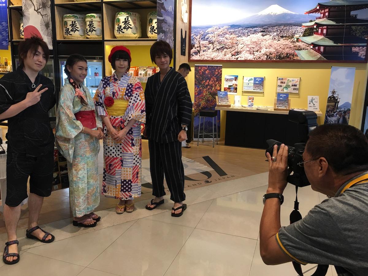 また、書道家、景谷真大氏によるパフォーマンスと東京恵比寿RICCAの美容師、渡辺健仁郎氏による「手拭い」を使ったヘアアレンジも行われた。イベントには、タイの歌手ルークターンさんとドーナツさんらが招待され、さらに来タイ中だった日本のバンド「バスロビ」のメンバーも花を添えた。パフォーマンスを見たタイの取材陣や集まった来店客らは、いちおうに感動の面持ちで見入っていた。