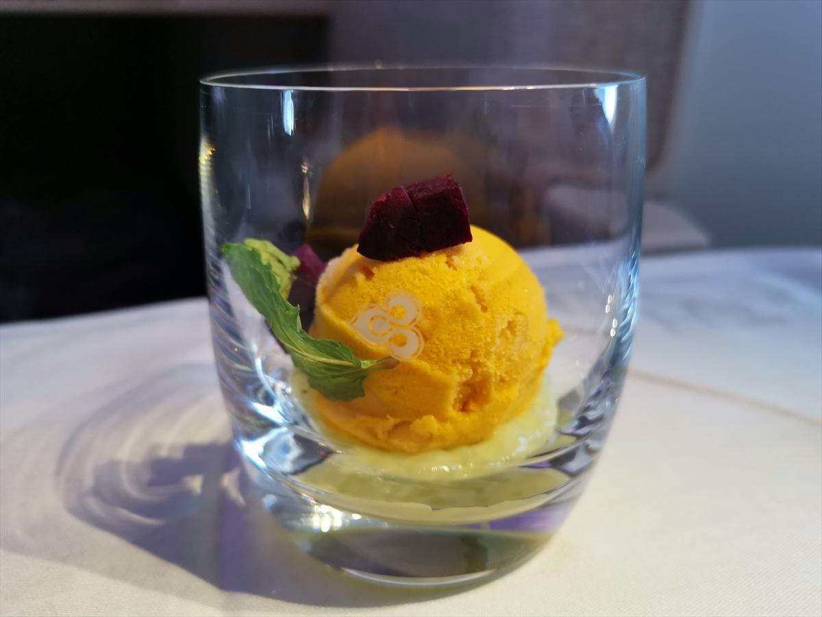 TG623便 関西発・バンコク行き(エアバスA350)ビジネスクラスのタイ料理・マンゴーアイスクリーム(2019年3月29日午後 機上「HUAWEI Mate 20 Pro」で撮影)