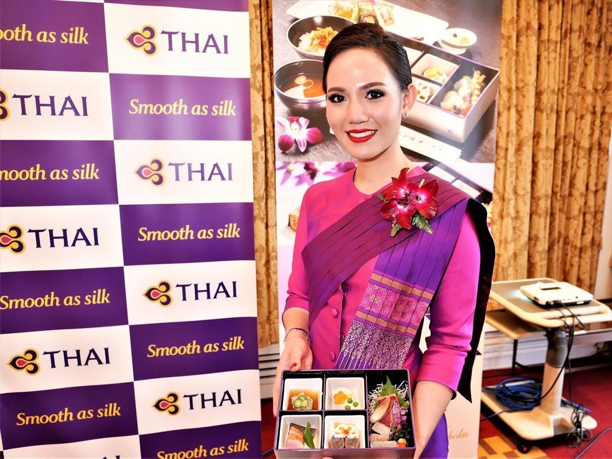 タイ国際航空は、ホテルオークラ東京「山里」監修の和食をファーストクラス、ビジネスクラスで提供2019年4月から(2019年3月22日、ホテルオークラ東京での、プレス発表会で撮影)
