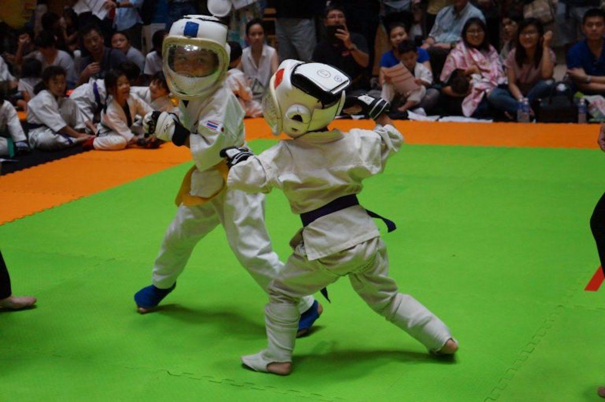 今回で6回目となる空手のオープン大会「e-body design杯」は、禅道会心技道場が主催。道場に通う子ども達を中心に100人以上が参加した。会場となったゲートウェイエカマイは、日本料理店が多く入居する商業施設でもあることから、普段から多くの日本好きタイ人が利用しており、イベントスペースに設けられた特設会場には、多くの観客も子ども達の奮闘に熱い声援を送っていた。