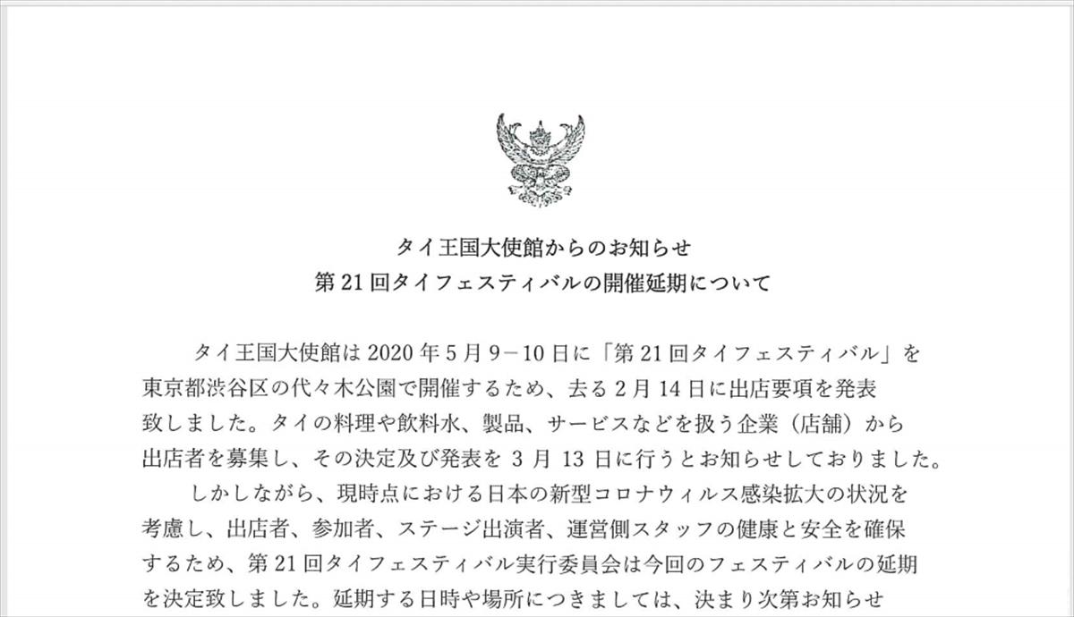 2020年3月13日、駐日タイ王国大使館は、5月9-10日に東京・代々木公園で開催予定だった「タイフェスティバル」の延期を発表した。延期開催日時や場所は未定。