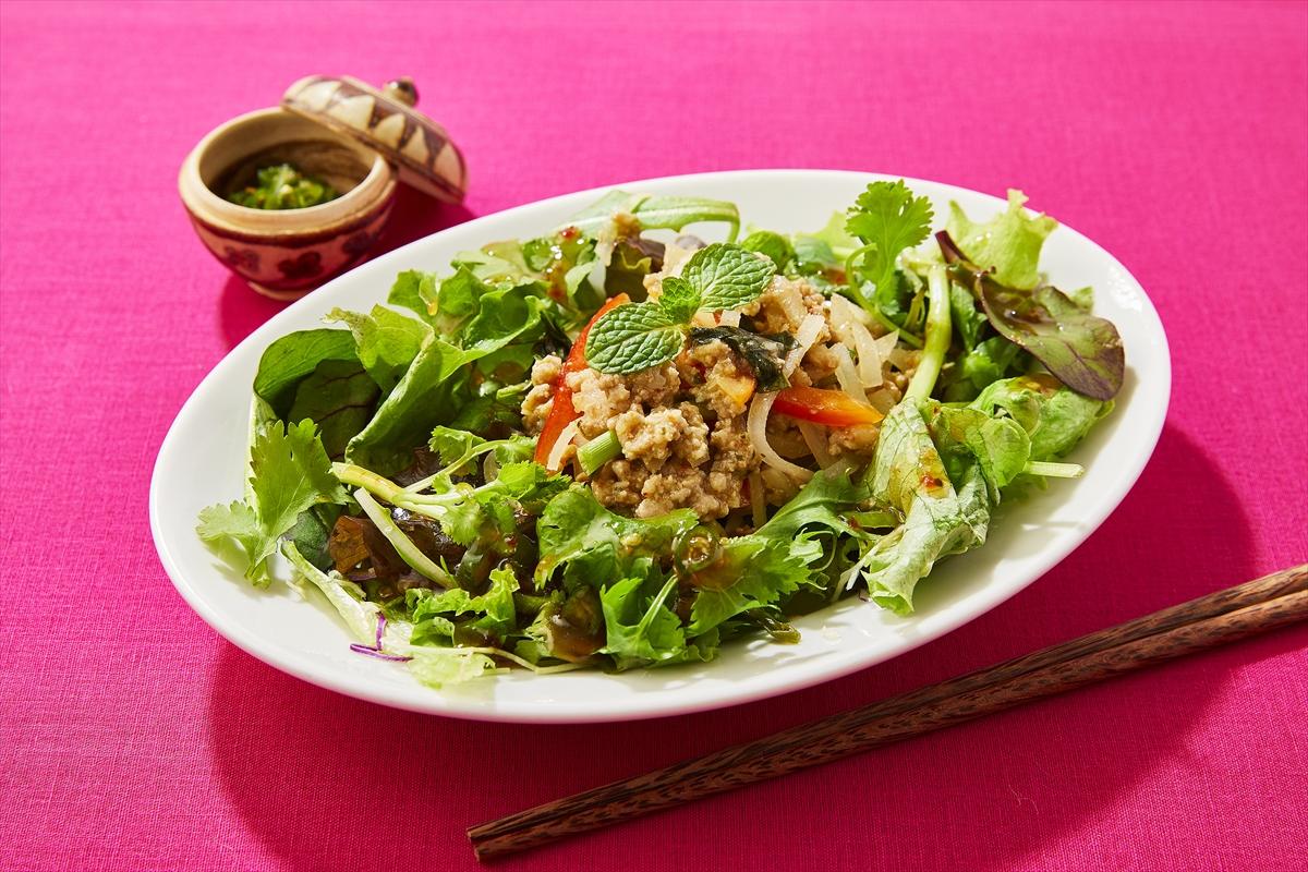 今回新たに登場するのは、米粉で作った麺と赤海老、青パパイヤなどを海老の旨みが効いたソースで仕上げた 「赤海老のパッタイ(タイ風焼きそば)」と、青唐辛子の効いたソースで味付けた豚ひき肉をミントやバジルのサラダといただく「ラープ(タイ風豚ひき肉のサラダ)」の2つのメニュー。
