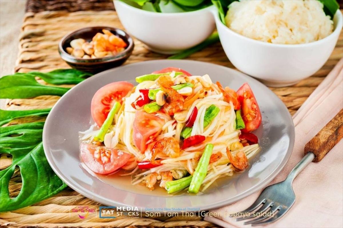 タイで一番知名度の高いサラダの作り方:ニンニク、唐辛子をすり鉢とすりこぎでつぶす。タマリンドジュース、魚醤、ピーナッツ、乾燥エビ、トマト、ライム果汁、サトウキビペースト、サヤインゲンと、細切りのグリーンパパイアを一握り加え軽く混ぜる。付け合せは餅米。カニ(som tam boo)と魚醤(som tam plah lah)で作るバージョンもあるが、オリジナルの風味とシンプルな優美さにはかなわない。