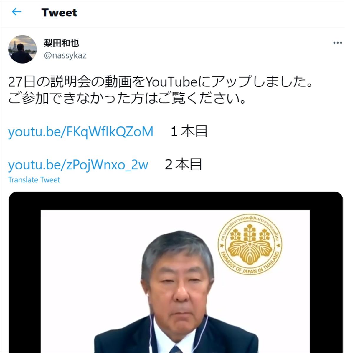 2021年8月11日、梨田和也在タイ日本大使のツイッターが現地在住者の間で好評で、登録者も7,000人を超えた。