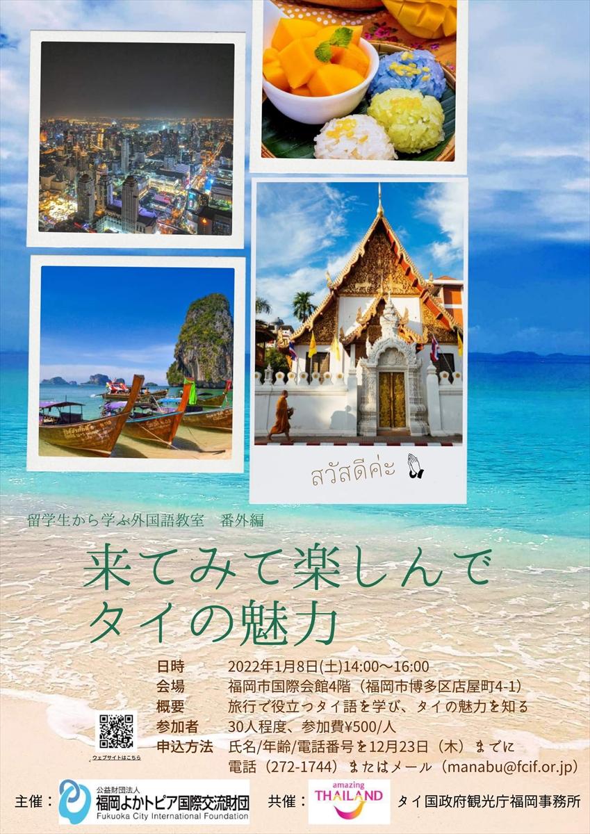 2022年1月8日・14時から、福岡よかトピア国際交流財団は、留学生から学ぶ外国語教室の番外編として『来てみて楽しんでタイの魅力』を開催する。