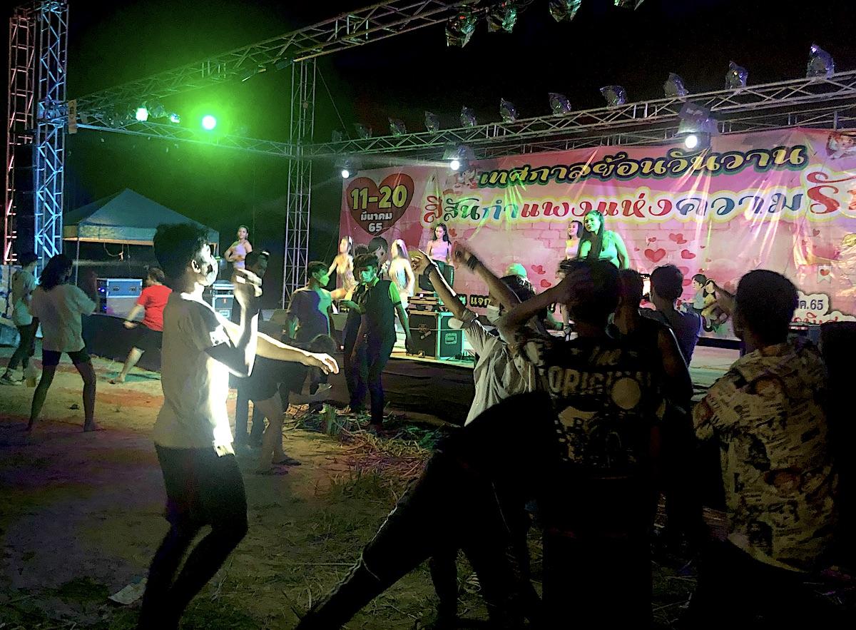 バンコク郊外、スワナプーム空港にもほど近いところで行われていた仮設市場を訪れると、そこには以前と同じように客寄せの仮設ステージが組まれ、華やかな衣装で歌う歌手たちを見ながらビールをあおる多くのタイ人の姿があった。