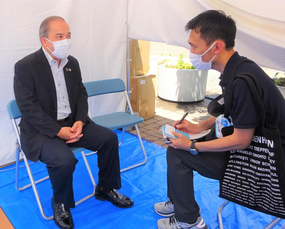 河北新報の取材を受ける、シントン・ラーピセートパン駐日タイ王国大使(左)「第10回 タイフェスティバル in 仙台 2022」勾当台公園市民広場(2022年6月25日、午前撮影)