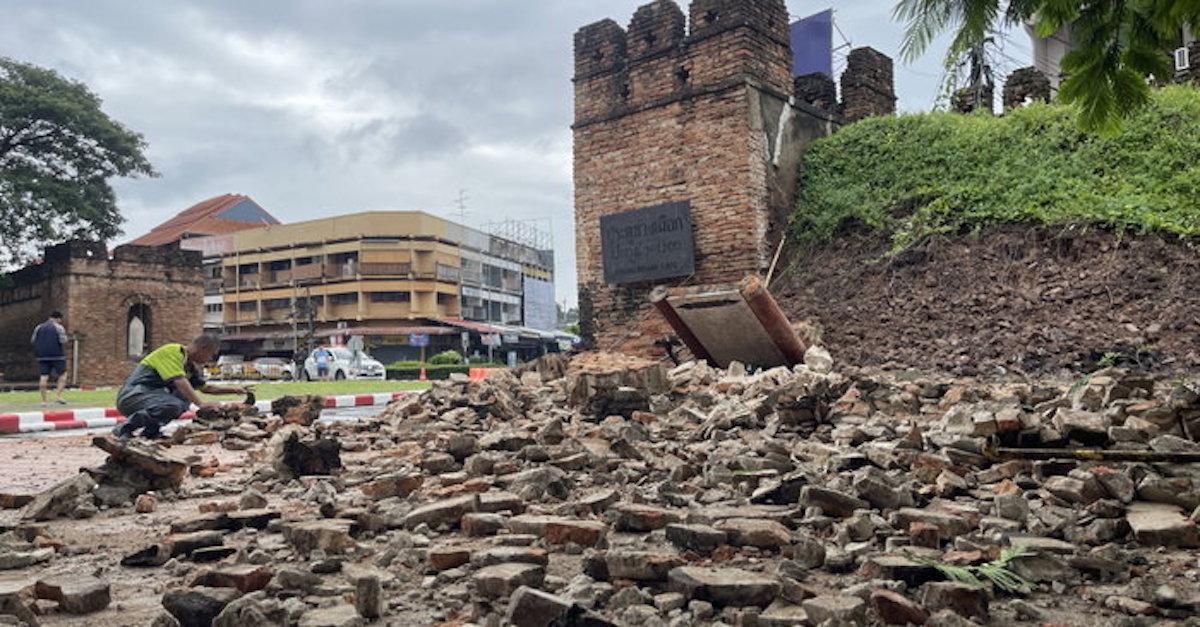 倒壊したチェンマイ旧市街の白象門(タイメディアより)