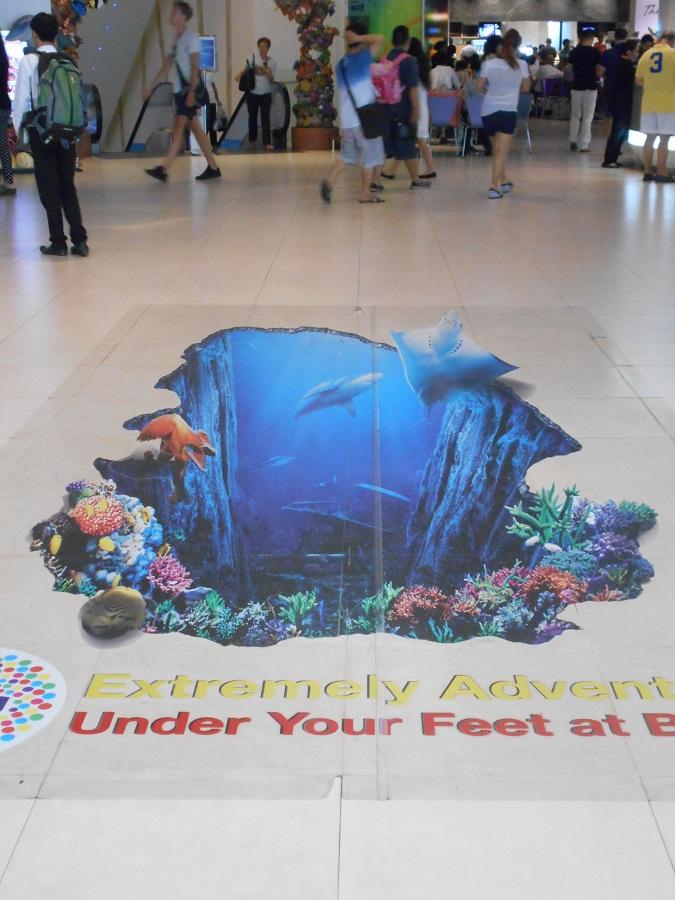 2014年8月17日、タイのバンコク都内にある商業施設の床に3Dアートが描かれているのを見つけた。一定の角度から写真を撮ることで立体的に見えるアートである。