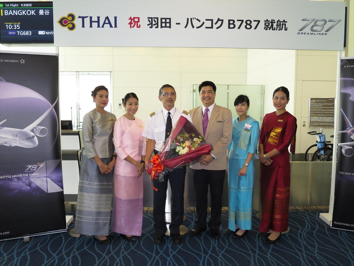 タイ国際航空には、100人の日本人フライトアテンダントが在籍していて、15人の日本人スタッフが、すでにB787の研修を終了している。初便には、日本人スタッフが2名乗務していたが、通常は1名乗務する予定。