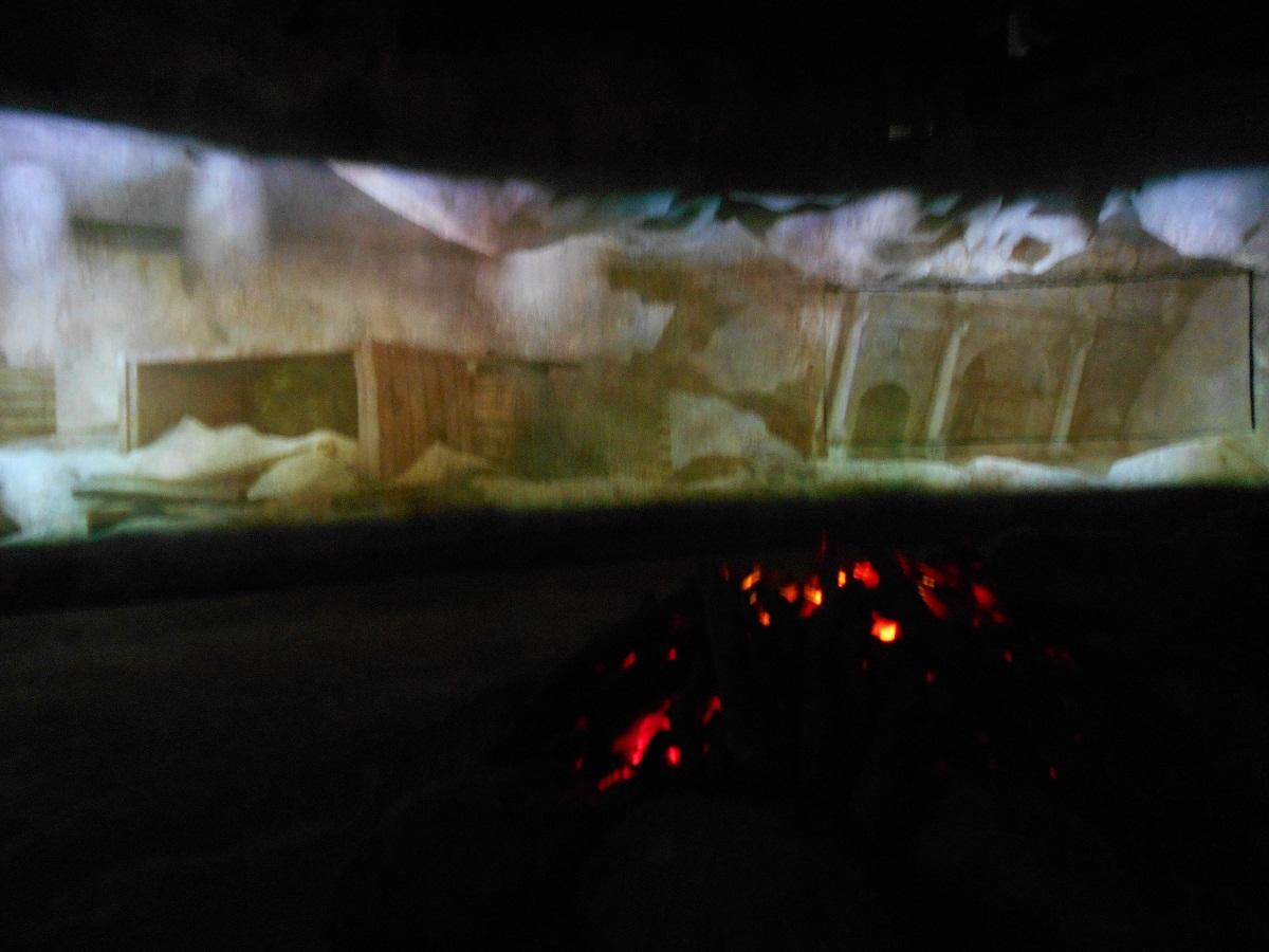 洞窟のような部屋でお金が誕生するまでの歴史を映像で学ぶ。中央には焚き火も。