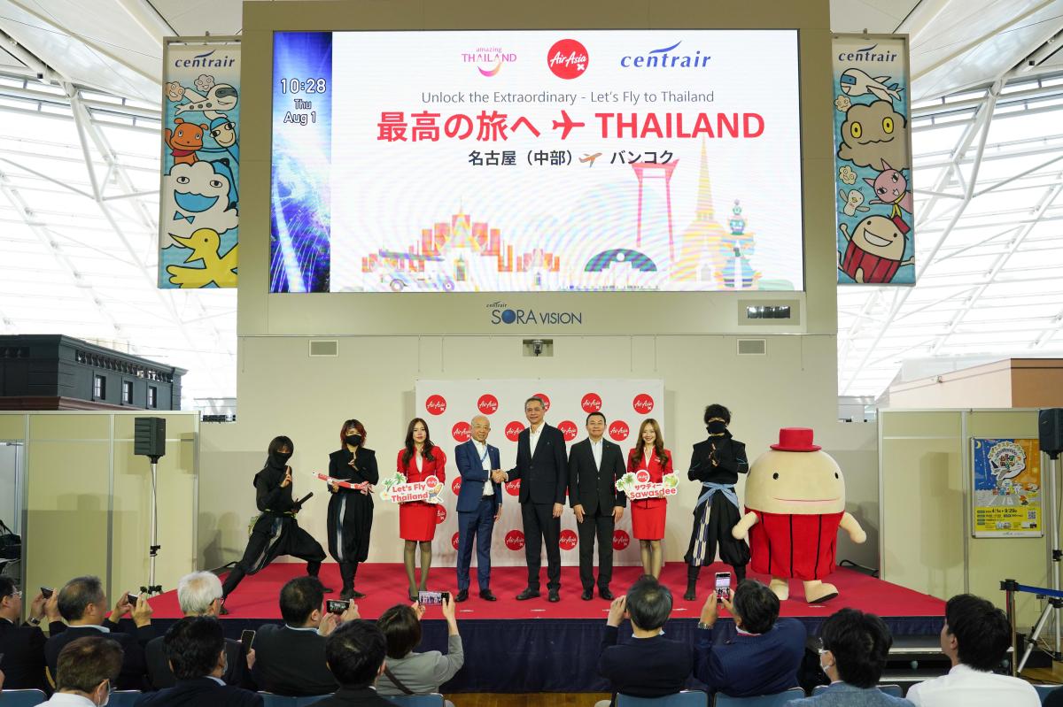 中部国際空港セントレアでは、約4年ぶりの就航を記念し、「タイ・エアアジア X 名古屋=バンコク線運航再開記念式典」が4階イベントプラザステージで開催された。