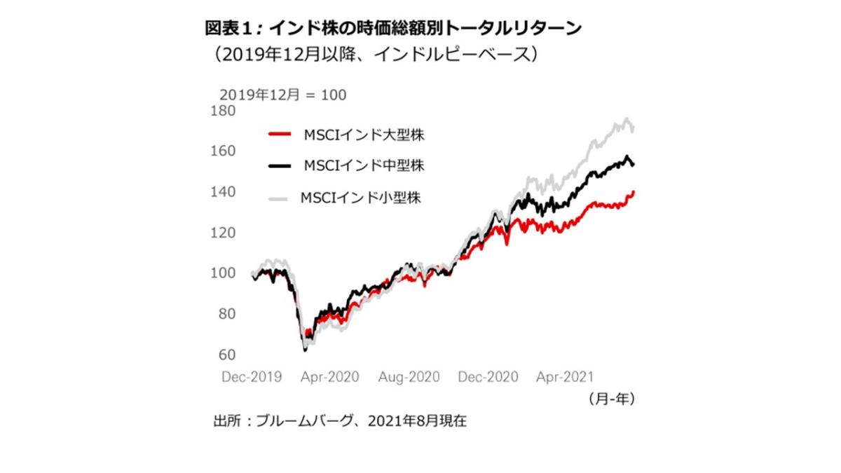 また、インド株式の中で見ると、最近は小型株が大型株を大きくアウトパフォームしていることがわかる。インド株式を時価総額別に見ると、小型株は中型株を15%程度アウトパフォームしており、さらに中型株は大型株を同程度アウトパフォームしている(図表1)。