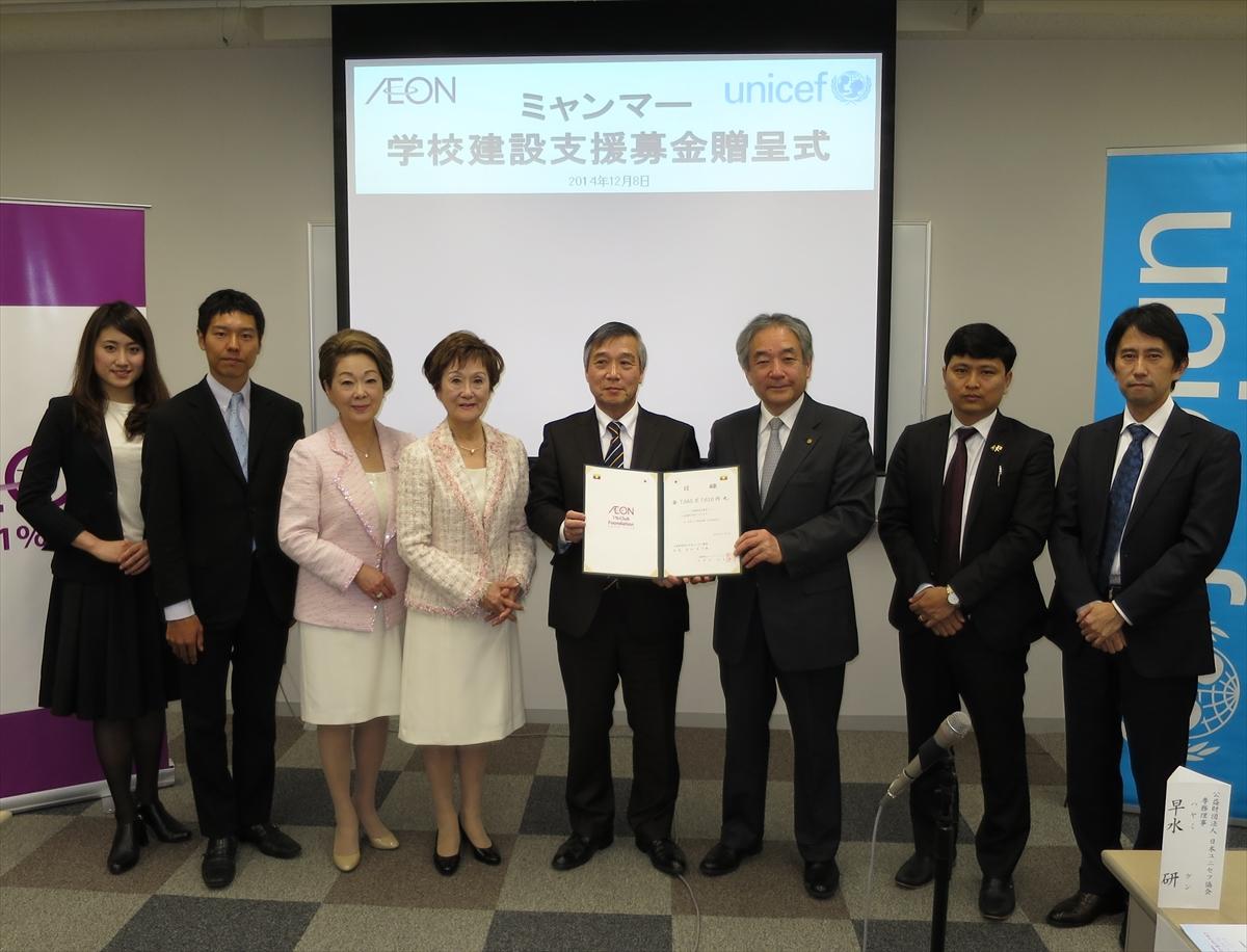 2014年12月8日、日本ユニセフ協会は、イオン1%クラブからユニセフがミャンマーで実施する教育支援活動の資金として、約7500万円の寄付を受領する贈呈式を行なった。