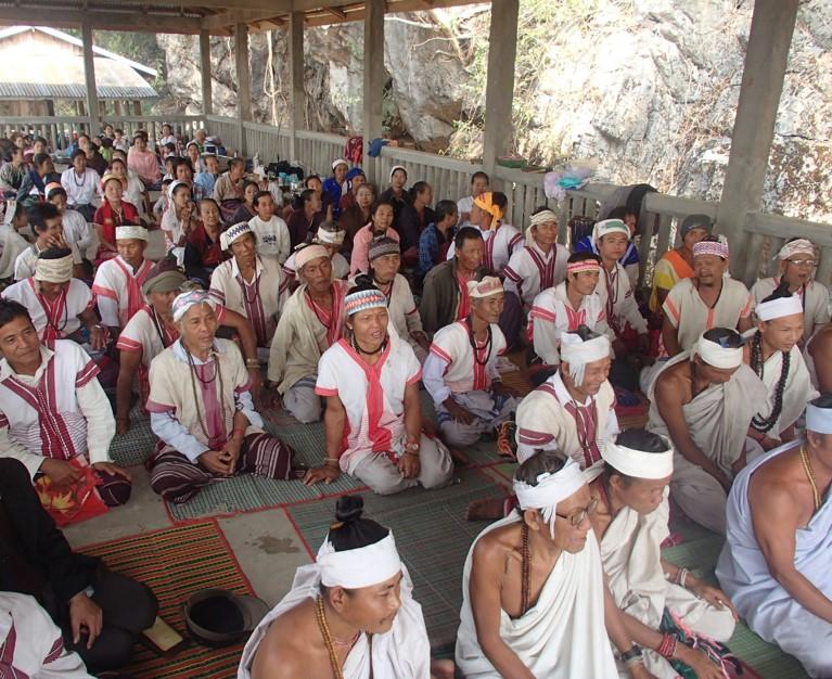再び車に乗り、四駆でさえ進むのが困難な悪路を2時間以上も進んだだろうか。最後は道も途絶え、方向感覚がなくなり、自分がどの辺りを走っているのか分からなくなった頃、開けた草原にその祭儀場が広がっていた。祈りの為か男たちは白装束に身を包み、白い鉢巻きを締めている。飛び交う言葉はカレン語ばかりで、ミャンマー語で話し掛けてもまるで通じない。その白装束の男達に守られるように、ナガーと呼ばれる龍の刺繍の入ったゆったりした金の袈裟を羽織ったポータケが座っていた。