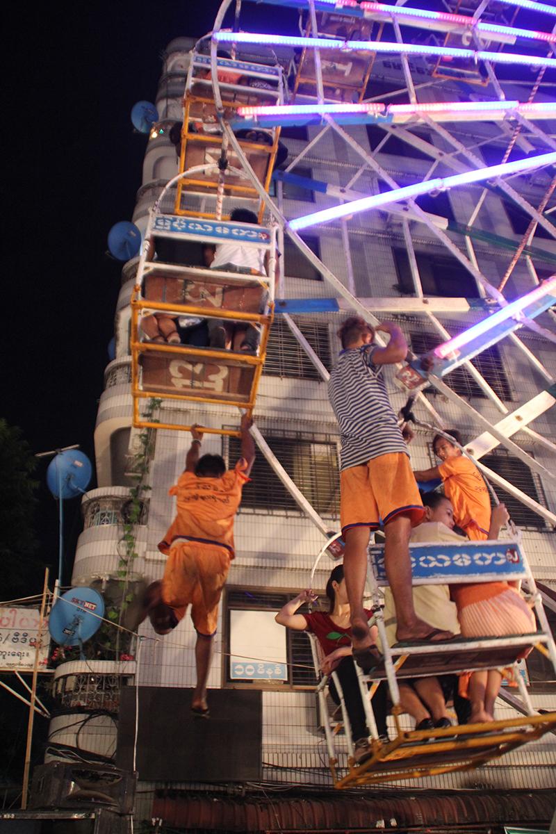 2016年10月16日、ミャンマーでは雨期明けを知らせるダディンジュの祭りを迎えた。ヤンゴンのダウンタウン東部などで恒例の縁日が開かれるが、そこで人気なのは祭りの日だけ登場する観覧車だ。この観覧車のすごいところは、人力で高速回転させるところだ。