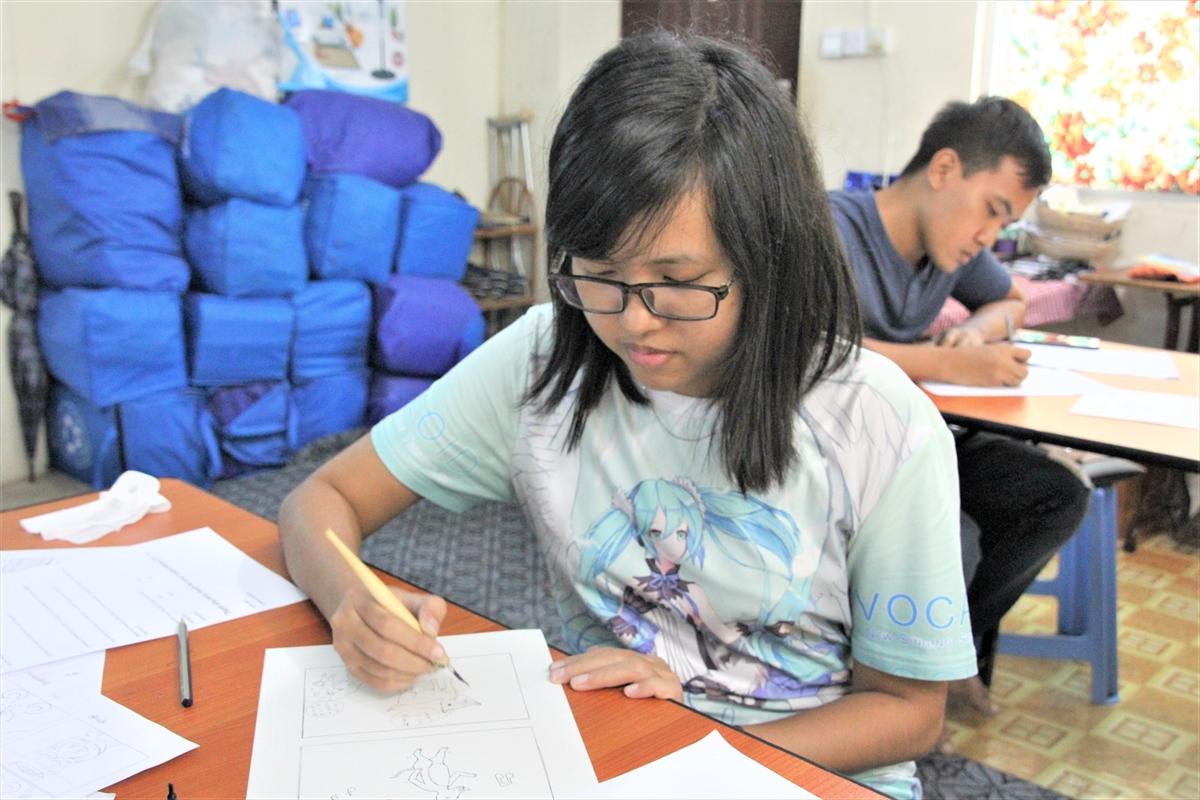 同日午前のワークショップには、6人のミャンマー人の男女が参加。ペンの使い方から始まり、2コマ漫画を制作した。「ネズミが踊る」という題をもとに、2コマの漫画を自ら考え作画する内容だ。自分でも「NARUTO」などの登場人物のイラストを描いていたというナンダーウーさん(23)は、ネズミが猫から隠れることに成功して踊っているという漫画を描いた。ペン入れを終えると「絵を描くのが慣れてないので難しかったけど、すごく楽しかった。これから自分で勉強してストーリー漫画を描きたい」と笑顔を浮かべた。