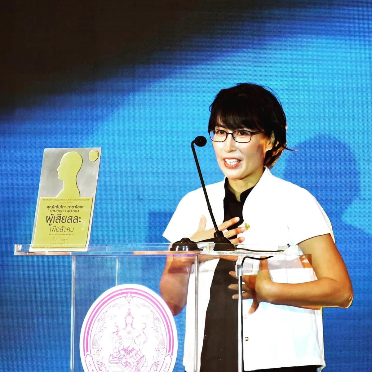社会貢献賞受賞式でスピーチする片岡朋子校長(写真提供:虹の学校)