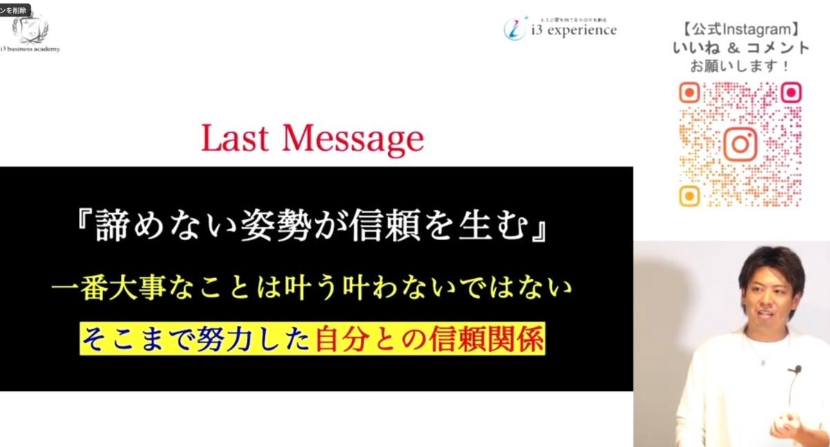 最後に受講生へ「『諦めない姿勢が信頼を生む』一番大事なことは叶う叶わないではない、そこまで努力してきた自分との信頼関係である」というメッセージを贈った。