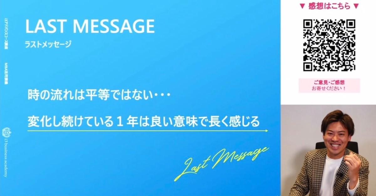 講義の終わりには、「時の流れは平等ではない…変化し続けている1年は良い意味で長く感じる」というメッセージが送られた。