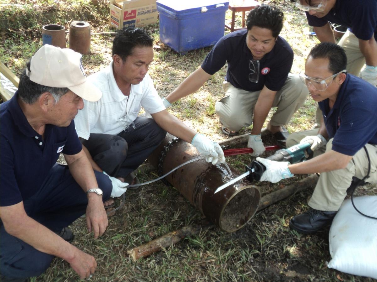 実はこの技法はすでに日本でも減りつつあるやり方である。危険であるし、機械で無人処理もある程度できるようになったためだ。ラオスではコストの問題、道路が劣悪で運び込めないなどの理由で導入が困難である。そのため、最終手段として現場でカットする方法を教え、ラオス人エキスパートだけでも活動ができるようにトレーニングを行う。資格認定は現場で3本以上の本物の不発弾のカット成功という命がけの試験になる。