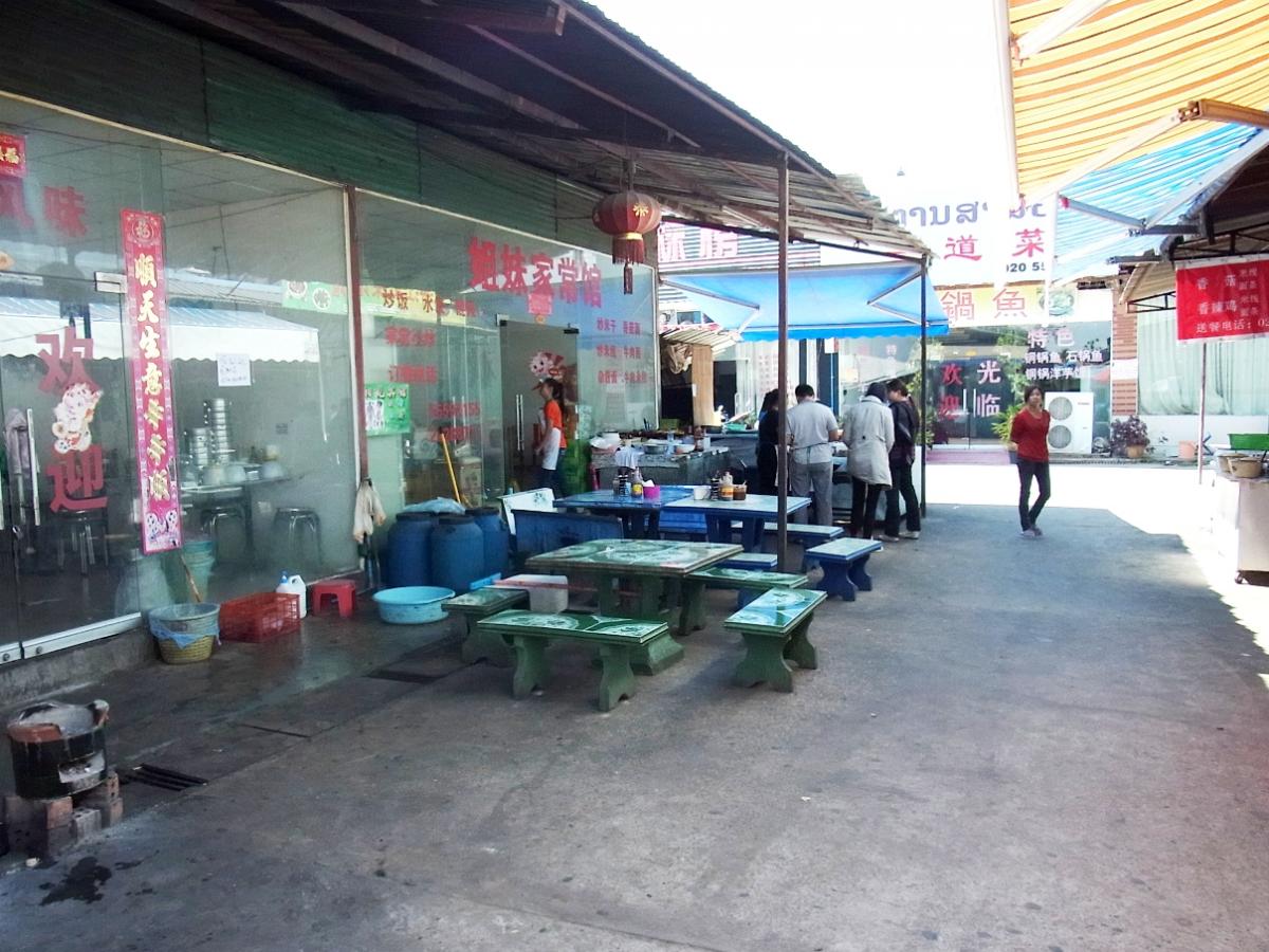 ここではラオス語はほとんど通じない。その分、飲食店などは本物の中華料理が楽しめる。表記は漢字なのでなんとか読み取れば注文は問題ないだろう。中でも麺類は材料が棚に並んでいるので、屋台風の店で指さし注文すれば簡単に頼める。